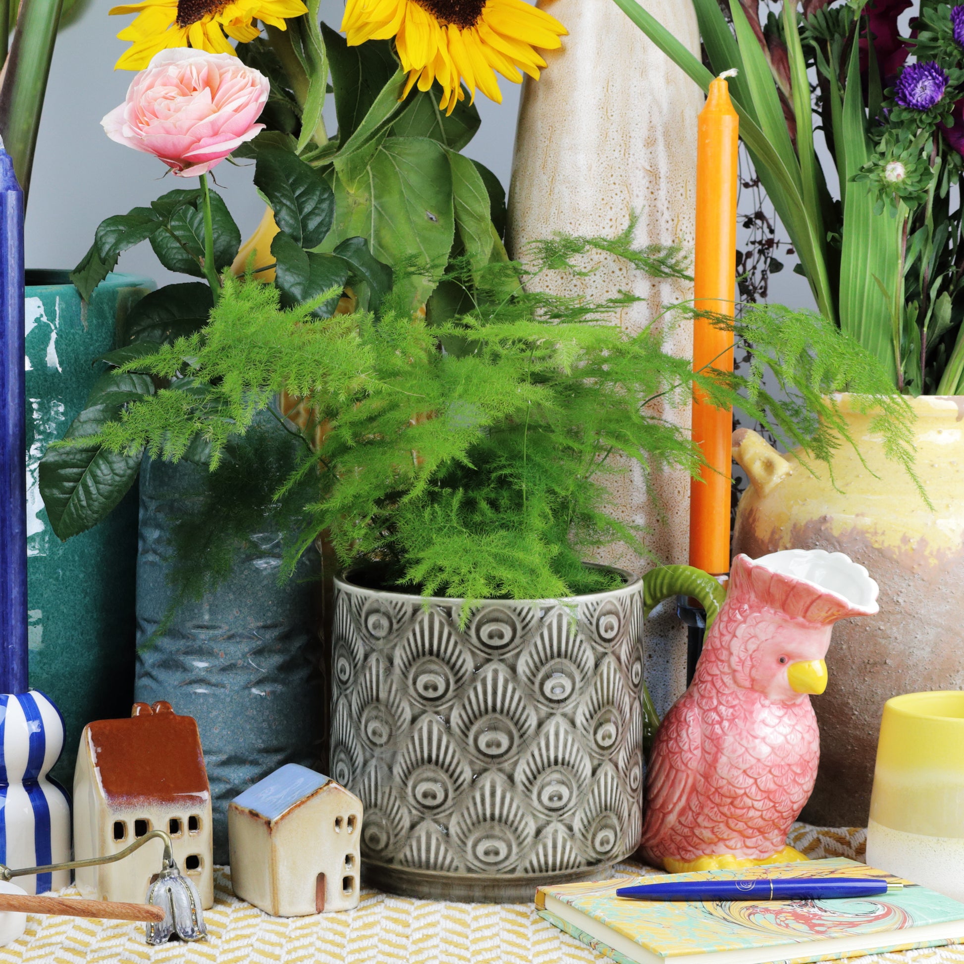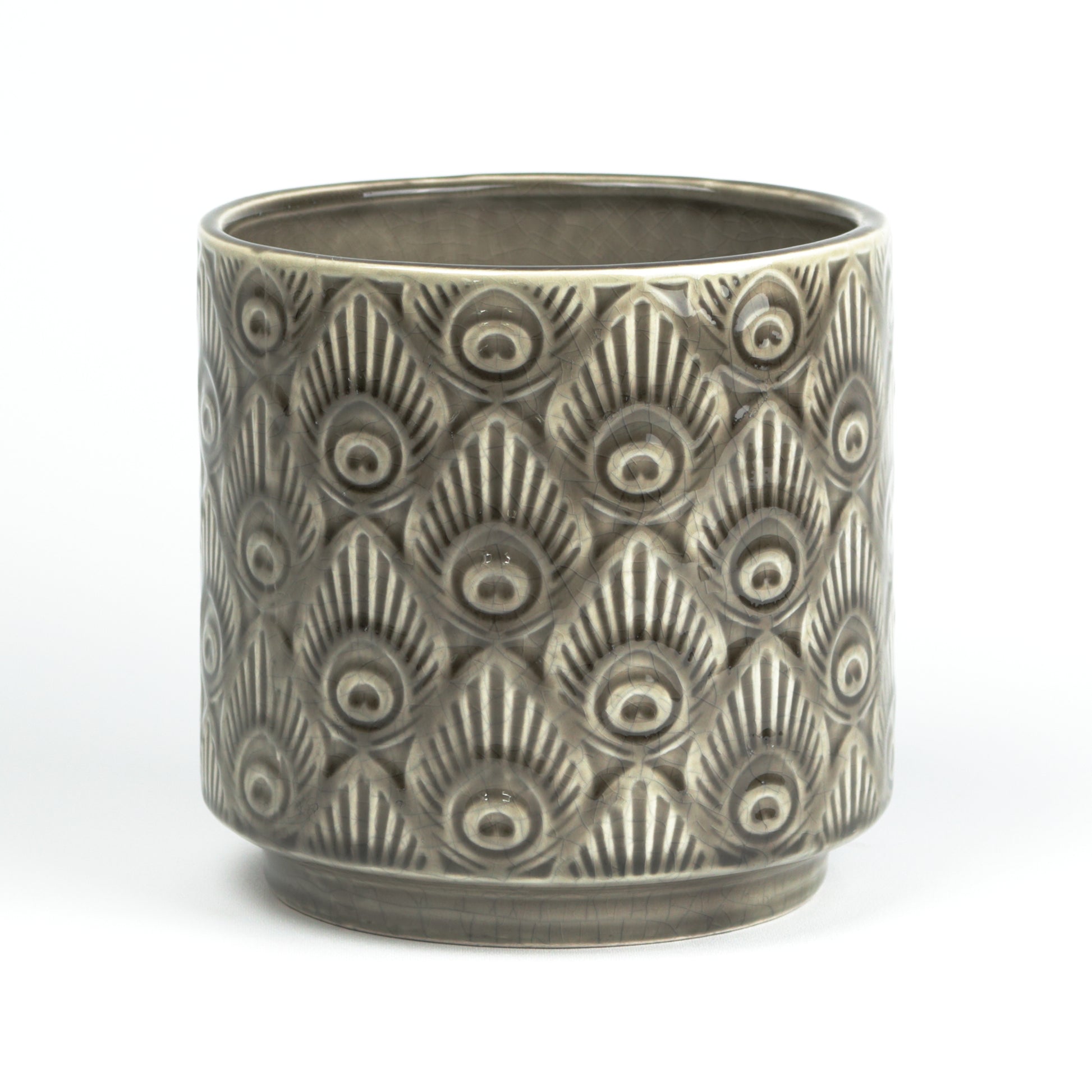 A quirky plant pot with a peacock feather pattern embossed throughout its surface. It comes in a cylinder shape, with an indented base. Glazed in a gentle taupe colour with a white base, picking out the details of the pattern. Handmade, each piece is unique. Sealed, no drainage holes. Available in two sizes.
