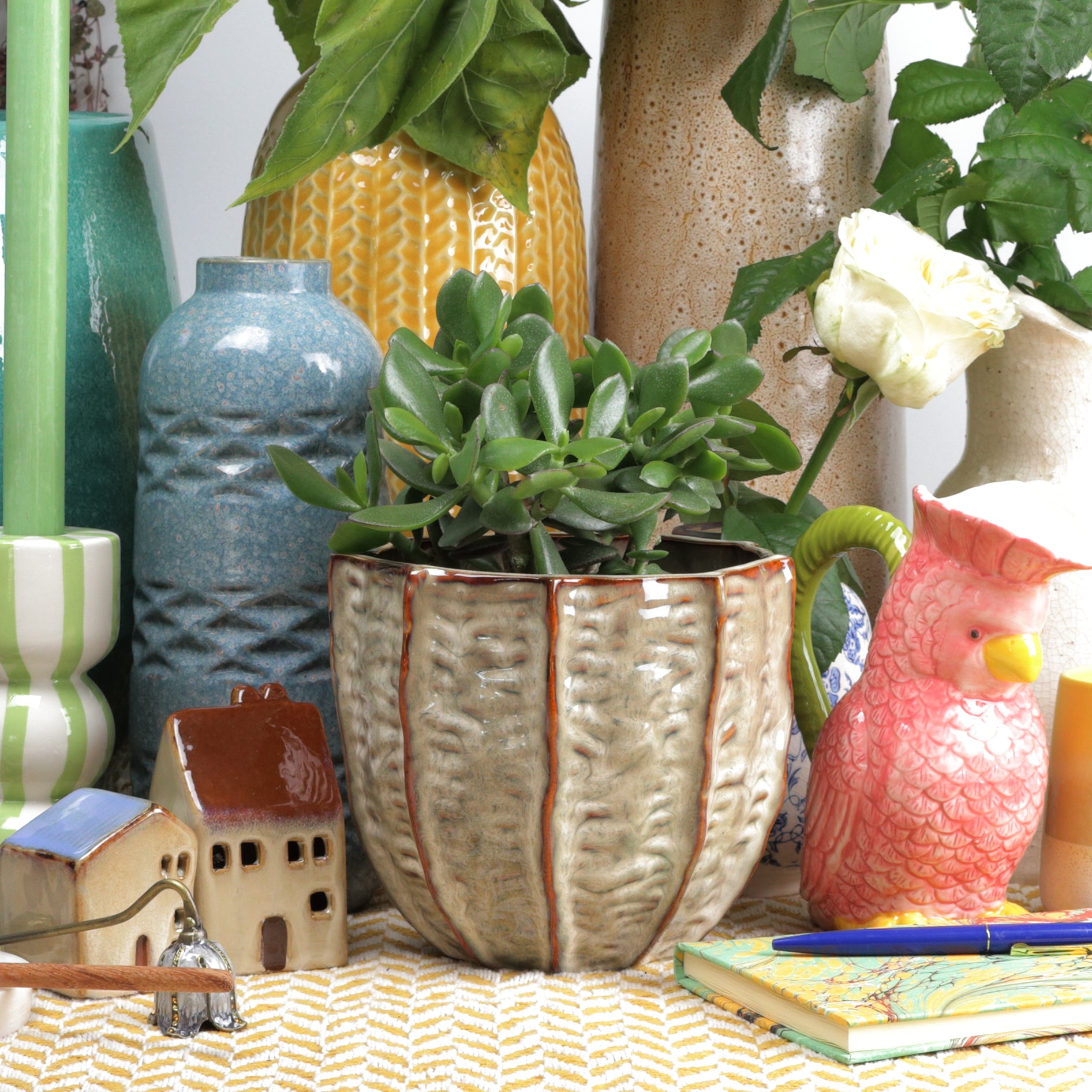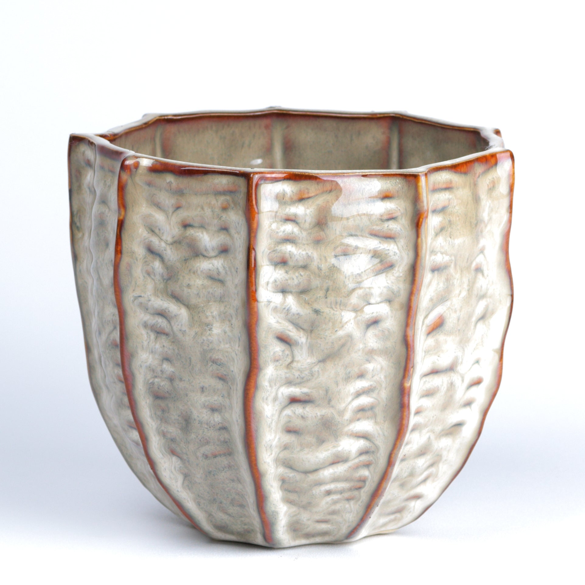 This pot is a striking architectural planter that brings sculptural elegance to any interior or garden setting. Its distinctive shell-inspired form creates visual interest whilst providing ample space for substantial plants and greenery. Crafted with refined aesthetics in mind, this statement piece elevates your botanical displays with understated sophistication. Handmade, each piece is unique. Sealed, no drainage holes. Available in two sizes.