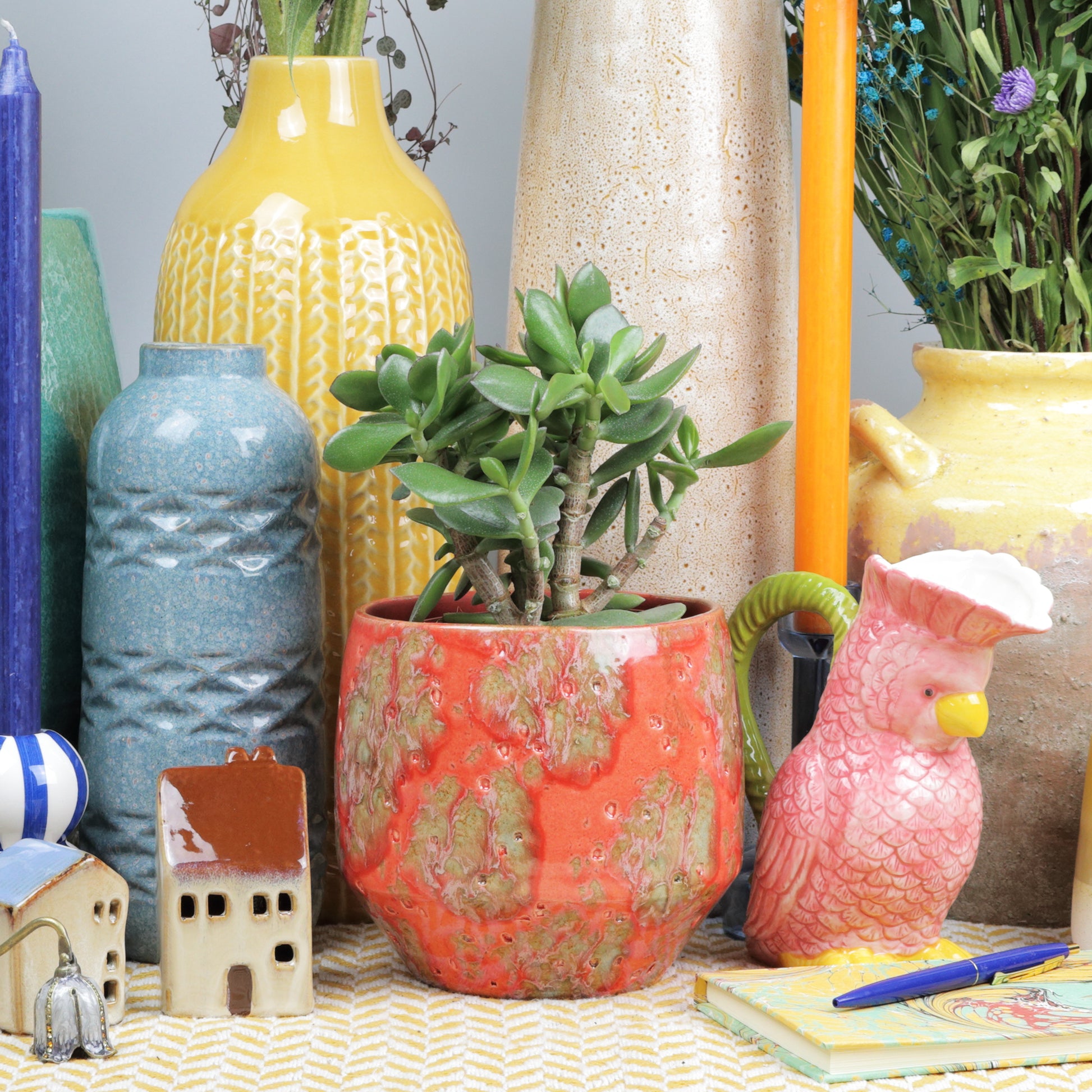 A bold yet charming planter, perfect for adding a touch of personality to your indoor foliage. This piece features a striking coral-red glaze, accented with textured mossy patches that create a unique, organic feel. Subtle pitting across the surface adds depth and interest, while the rounded shape offers a soft, modern silhouette. Handmade, each piece is unique. Sealed, no drainage holes. Available in three sizes.