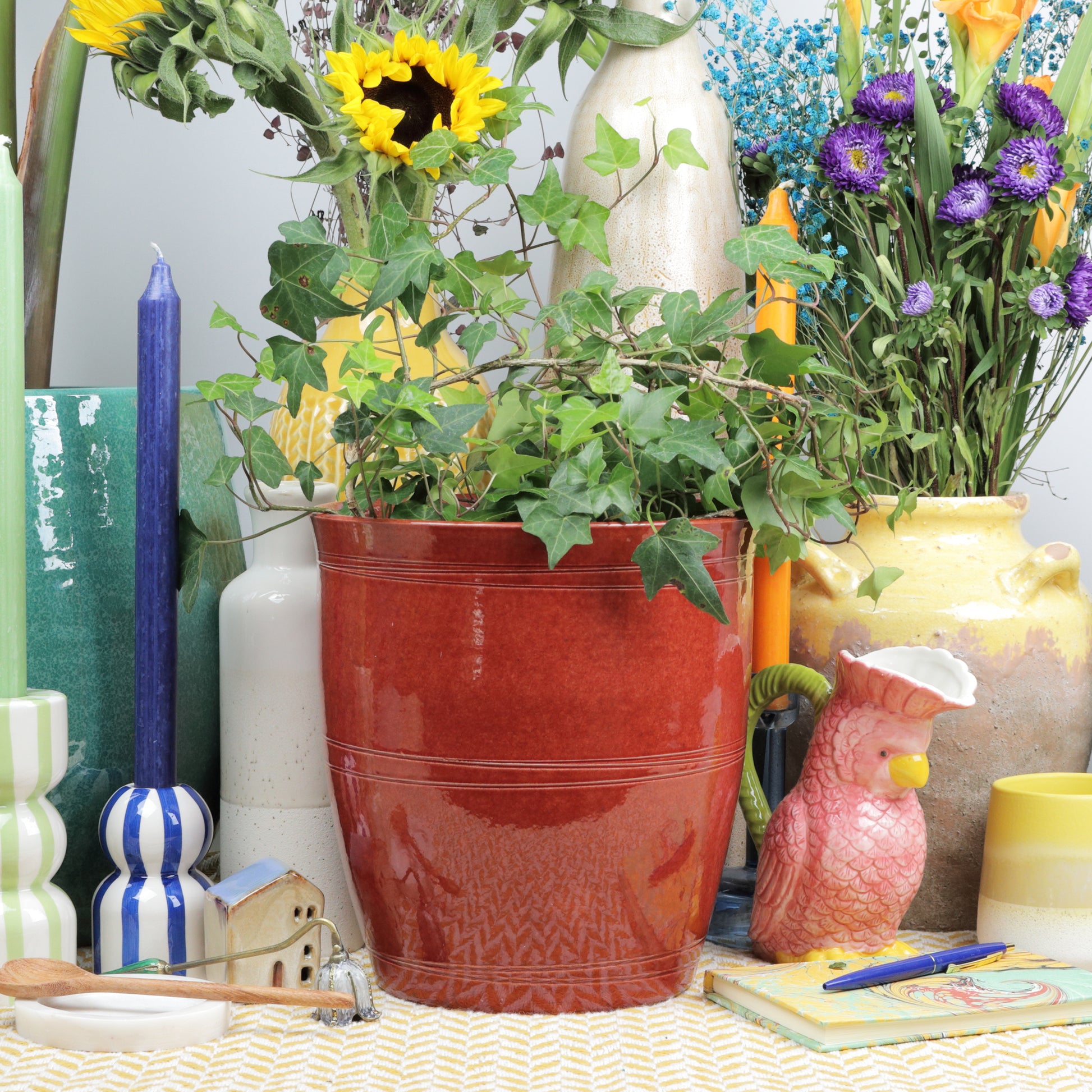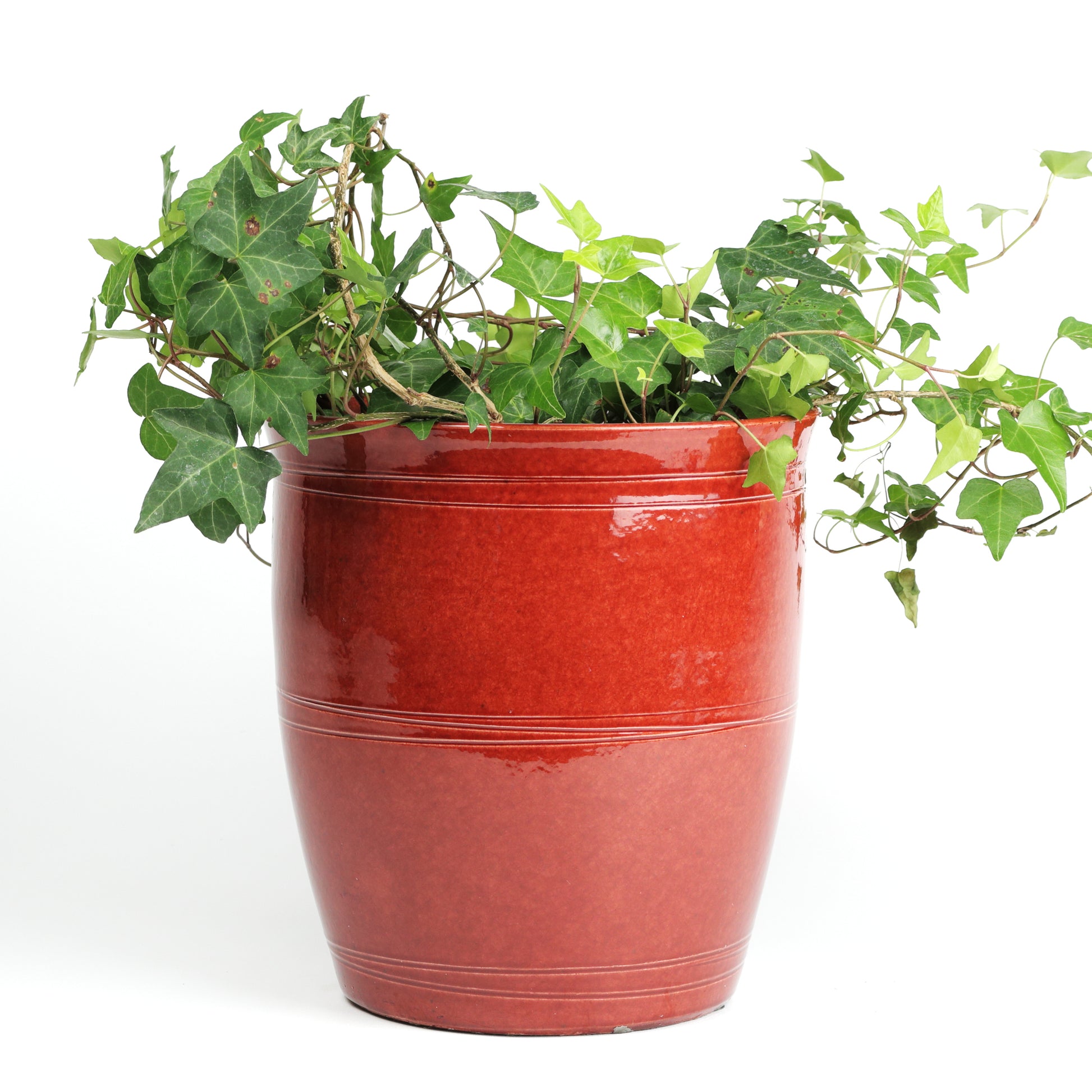 A bold pot, finished with a rich, glossy red glaze, allowing it's surface to catch the light beautifully, adding depth and vibrancy. The gently flared shape is accentuated by fine horizontal lines, giving a subtle touch of detail to its smooth form. Perfect as a statement piece on its own or as a striking contrast to lush green foliage. Handmade, each piece is unique. Sealed, no drainage holes.