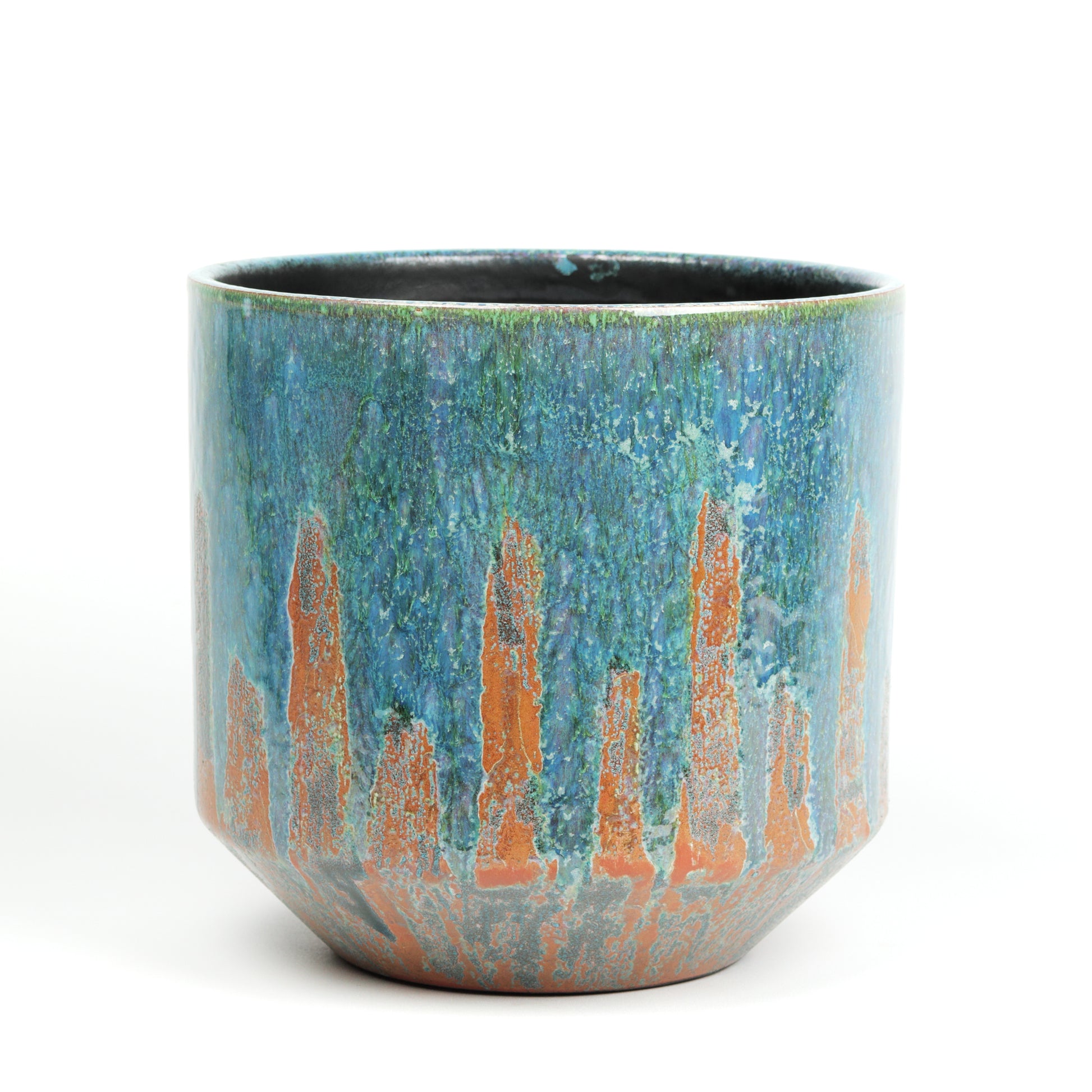 A rich mix of teal with pine green undertones and an textured russet base that reaches up; this pot is the perfect addition to a household collection. The antique finish combined with it's modern tapered design means it is never out of place amongst a display or apt as a standalone piece. Sealed, no drainage holes. Available in 3 sizes.