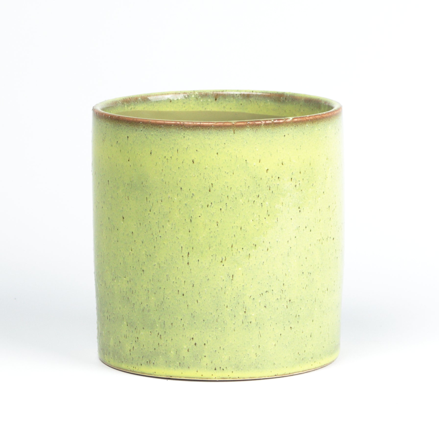 A simple yet lovely plant pot, in a happy summer green colour. The outer surface is textured, allowing it to pick up the details of the two layers of glaze used, adding depth to the colour and aesthetic. The cylinder shape makes it a versatile piece, which works in all decor designs. Handmade, each piece is unique. Sealed, no drainage holes. Available in two sizes.