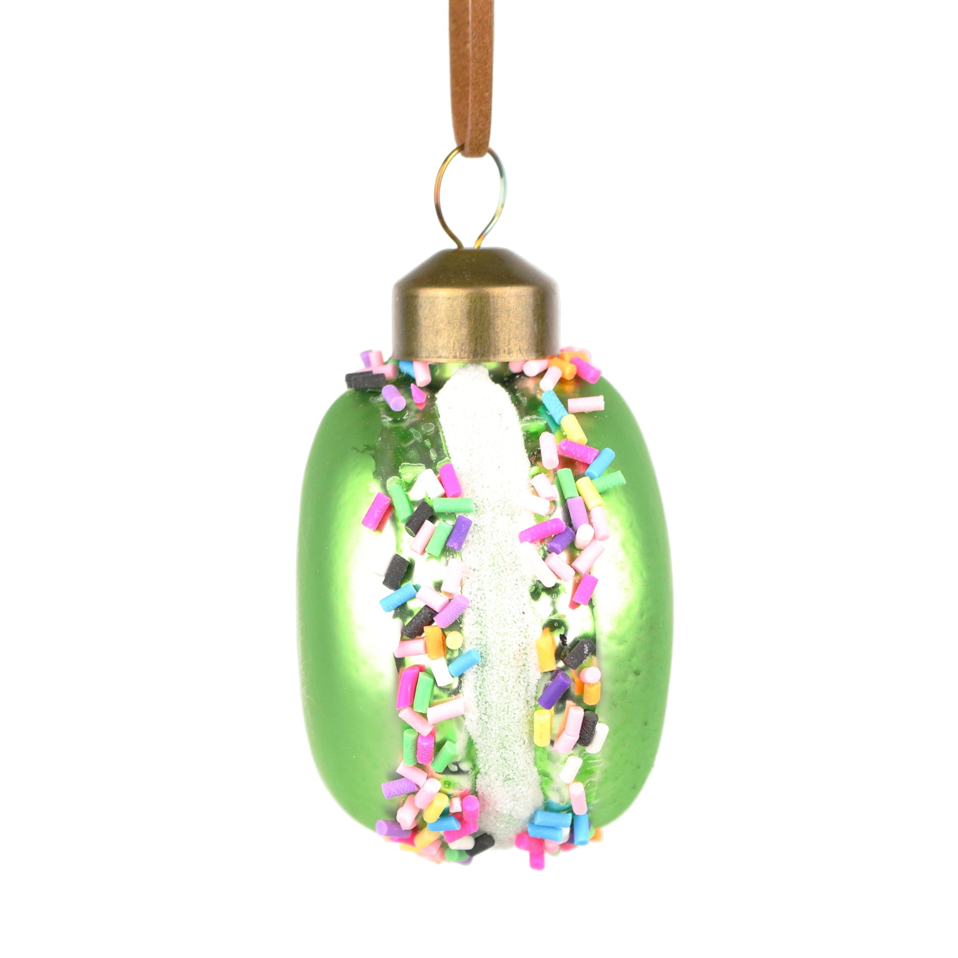Delicate and charming, this lime macaron bauble brings a touch of French elegance to your festive décor. Crafted with handblown glass with meticulous attention to detail, the soft pastel hue captures the essence of a classic patisserie favourite in miniature form. A delightful fusion of culinary artistry and seasonal sophistication. Handmade, each piece is unique.