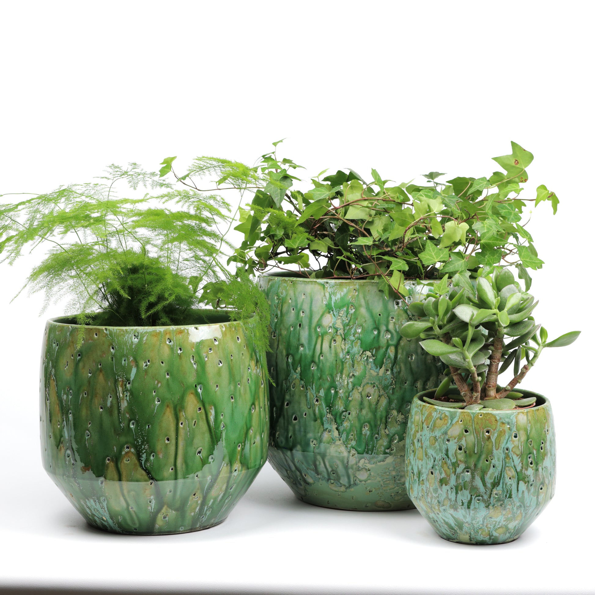 A vibrant pot with a dynamic green glaze that cascades in natural, fluid patterns. Subtle golden tones peek through the surface, adding warmth and depth to its organic texture. Its lively character and rich finish make it a captivating statement piece for any setting. Handmade, each piece is unique. Sealed, no drainage holes. Available in three sizes.