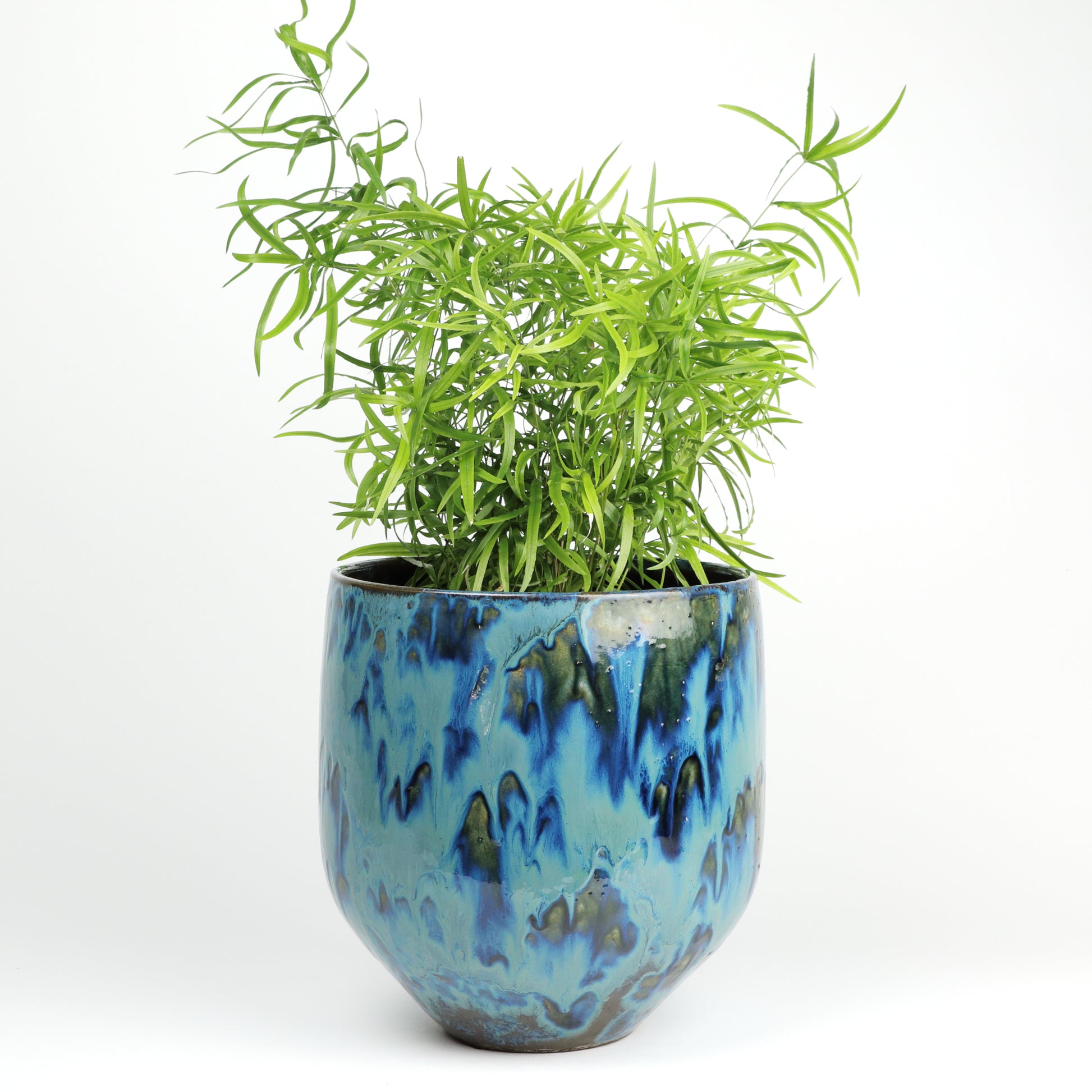 A bold and captivating plant pot with a flowing glaze. Shades of turquoise, deep blue, and aqua cascade across the surface, creating the look of liquid movement frozen in time that is richly expressive and full of depth. Handmade, each piece is unique. Sealed, no drainage holes. Available in three sizes.