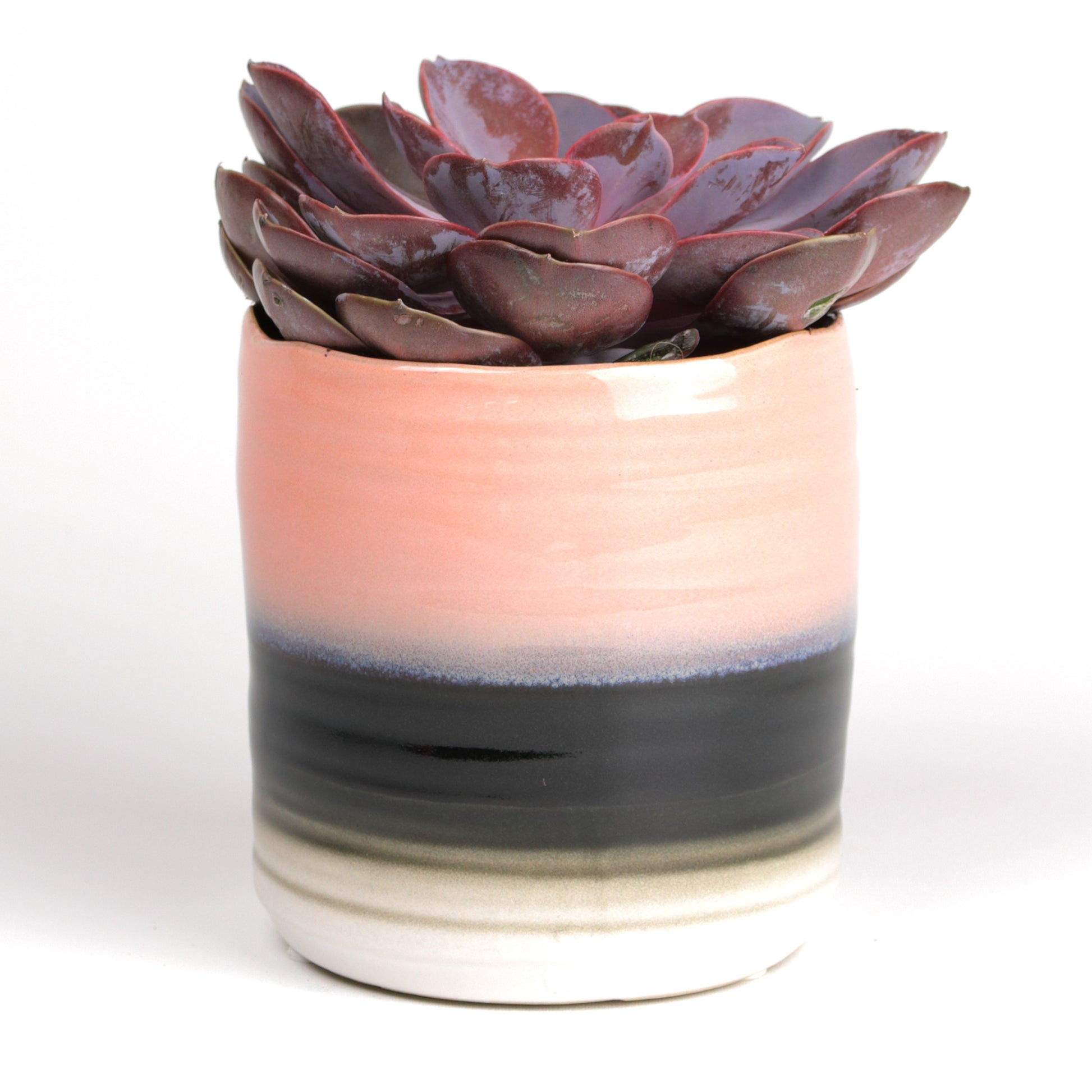 Bring a touch of coastal serenity to your home with this handcrafted ceramic pot. Featuring soft, layered hues of pink, black and white, it evokes the gentle transitions between day and night on the ocean surface. The smooth, glossy glaze and organic rim give it a natural, artisanal charm, perfect for adding character to any room. Ideal for small plants, succulents, or as a decorative accent, this pot effortlessly blends modern design with earthy tranquillity. Handmade, each piece is unique. Sealed, no drainage holes.