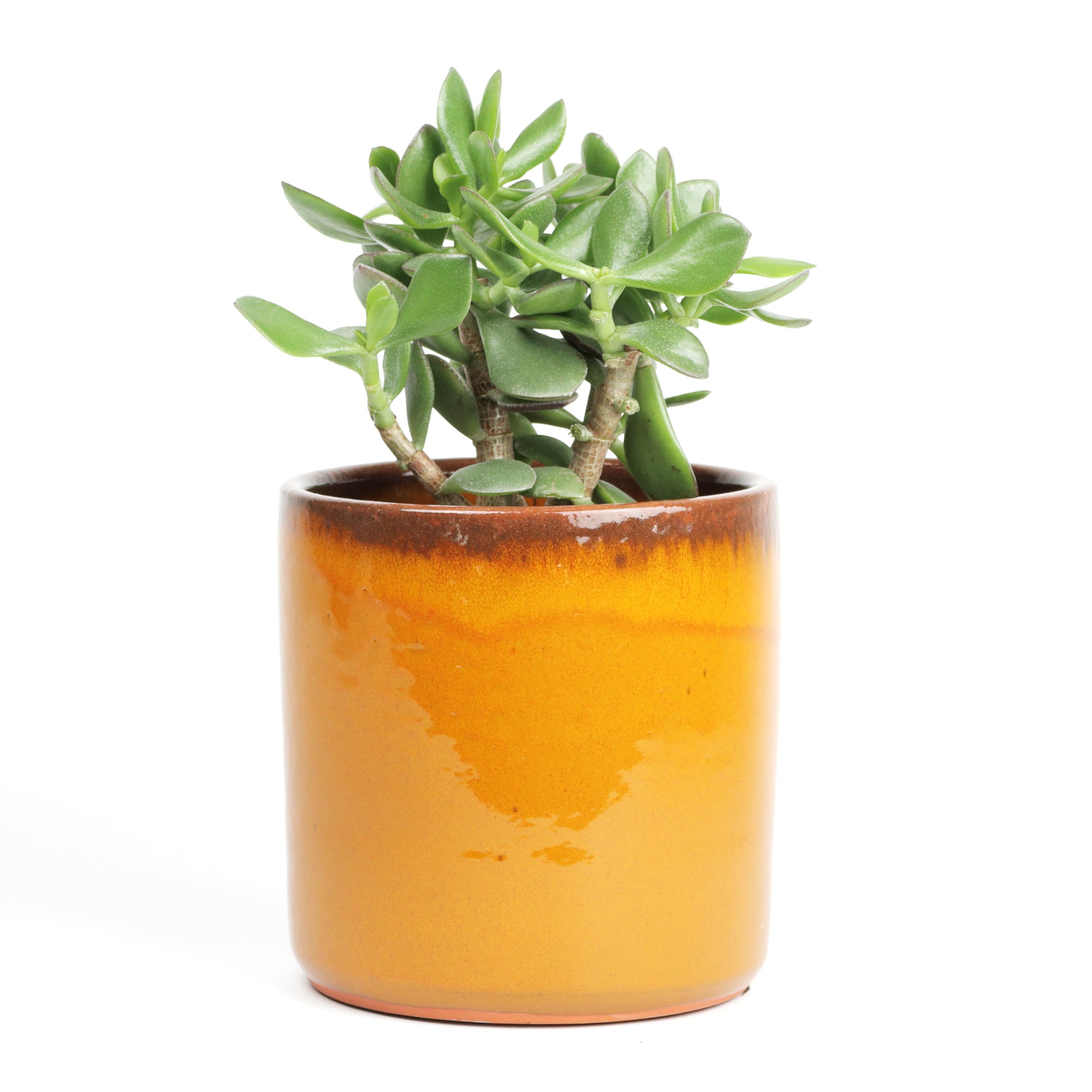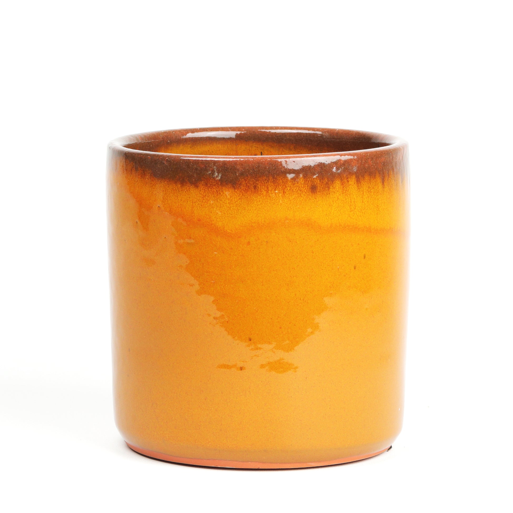 A beautiful sunset inspired plant pot, the perfect colour pop for any interior. Hand thrown in a cylindrical shape, with thick walls, these sturdy pieces will stand the test of time. Glazed in a vibrant amber base, with a brown rim, the contrast is beautifully playful. Handmade in Portugal. Sealed, no drainage holes. Available in three sizes.