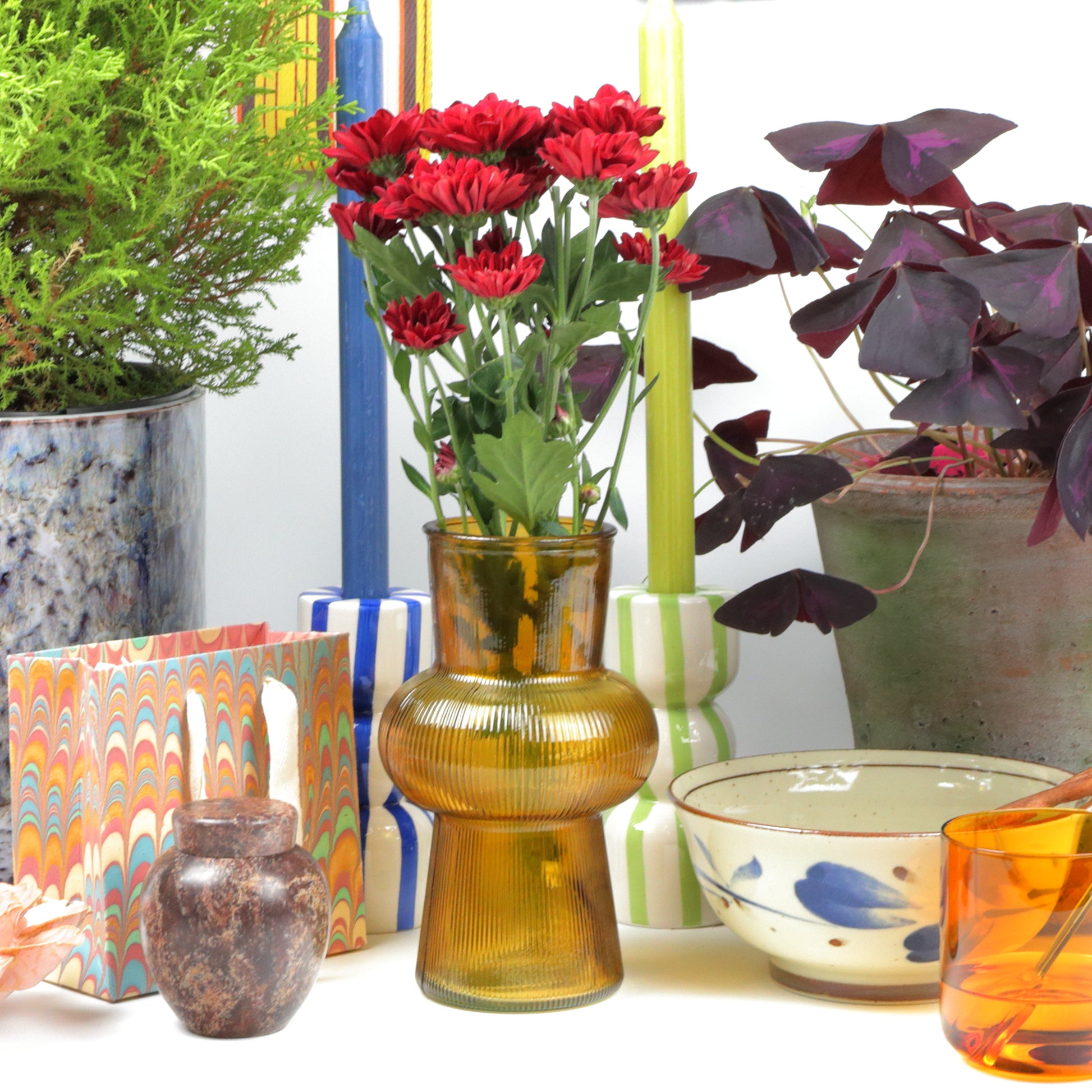 A contemporary vase with architectural presence, defined by its tapered cone silhouette and carefully crafted ribbed texture. The rich amber finish brings depth and sophistication to any space, whilst the linear detailing creates captivating interplay of light and shadow. Whether showcasing dried stems or standing alone as sculptural décor, this piece elevates modern interiors with understated refinement and timeless appeal. Handmade, each piece is unique.