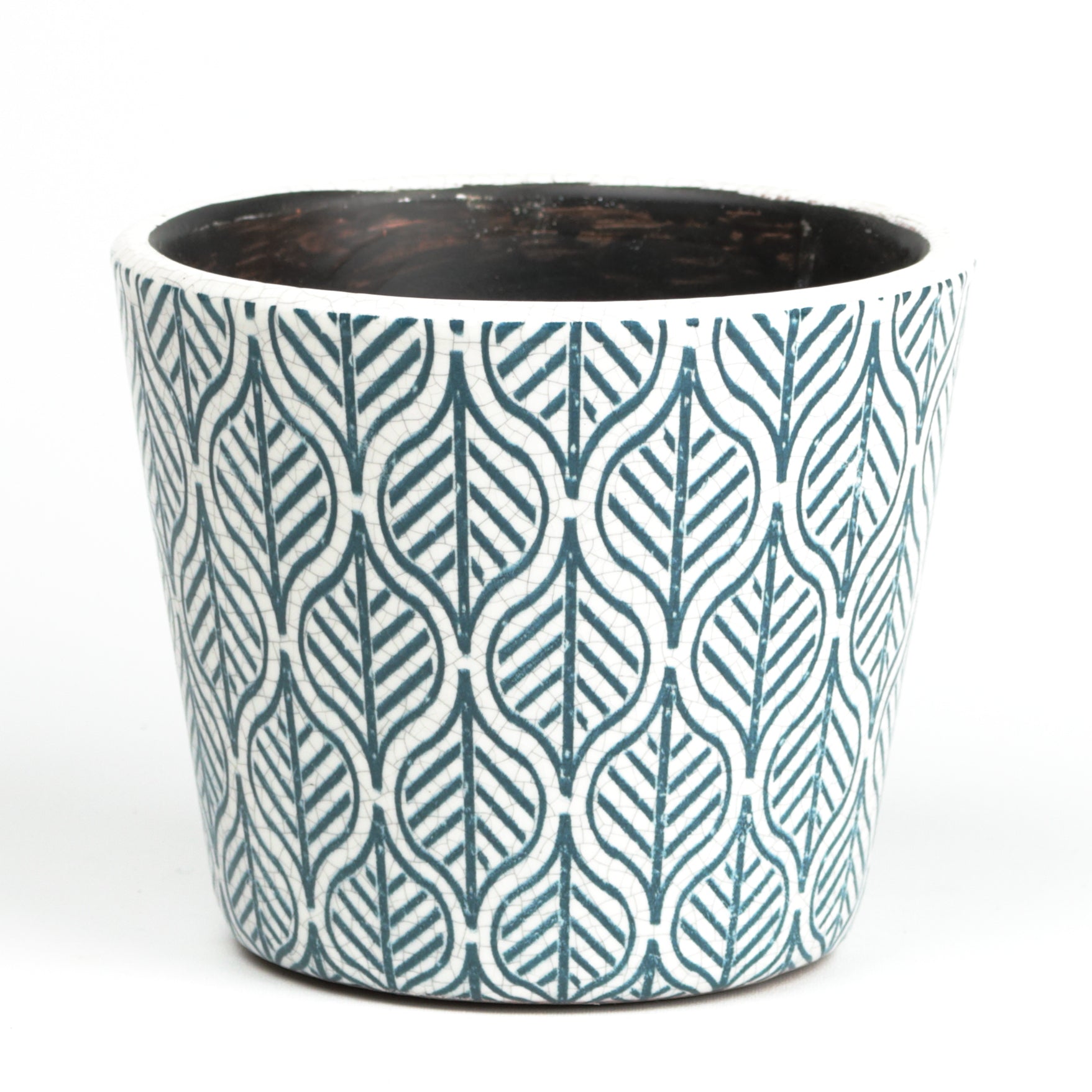 A simple pot that compliments any plant it houses with it's ivory body and teal structured leaf designs. This pot is crackle glazed giving it a quaint look that is loved by many due to it's ability to add a rustic look to your interior. Handmade, each piece is unique. Sealed, no drainage holes.